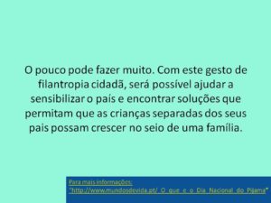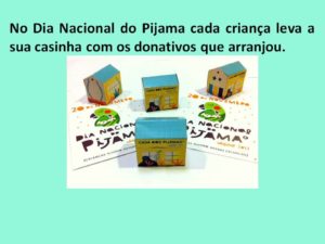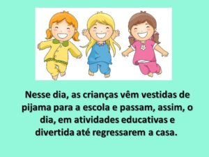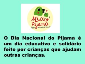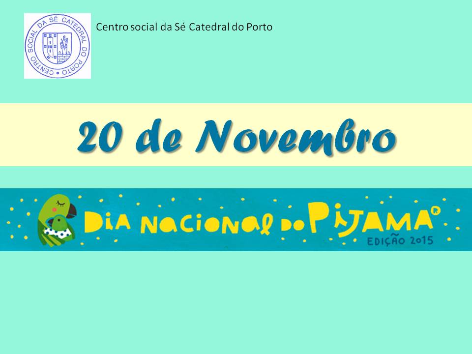 Eventos, Infância Dia Nacional do Pijama 17 Novembro, 2015 Susana Gomes Informam-se todos os pais que na próxima sexta-feira, dia 20, celebramos o Dia Nacional do Pijama! Como nos anos anteriores, todas as crianças têm de vir vestidas de Pijama!!! Não se esqueçam!