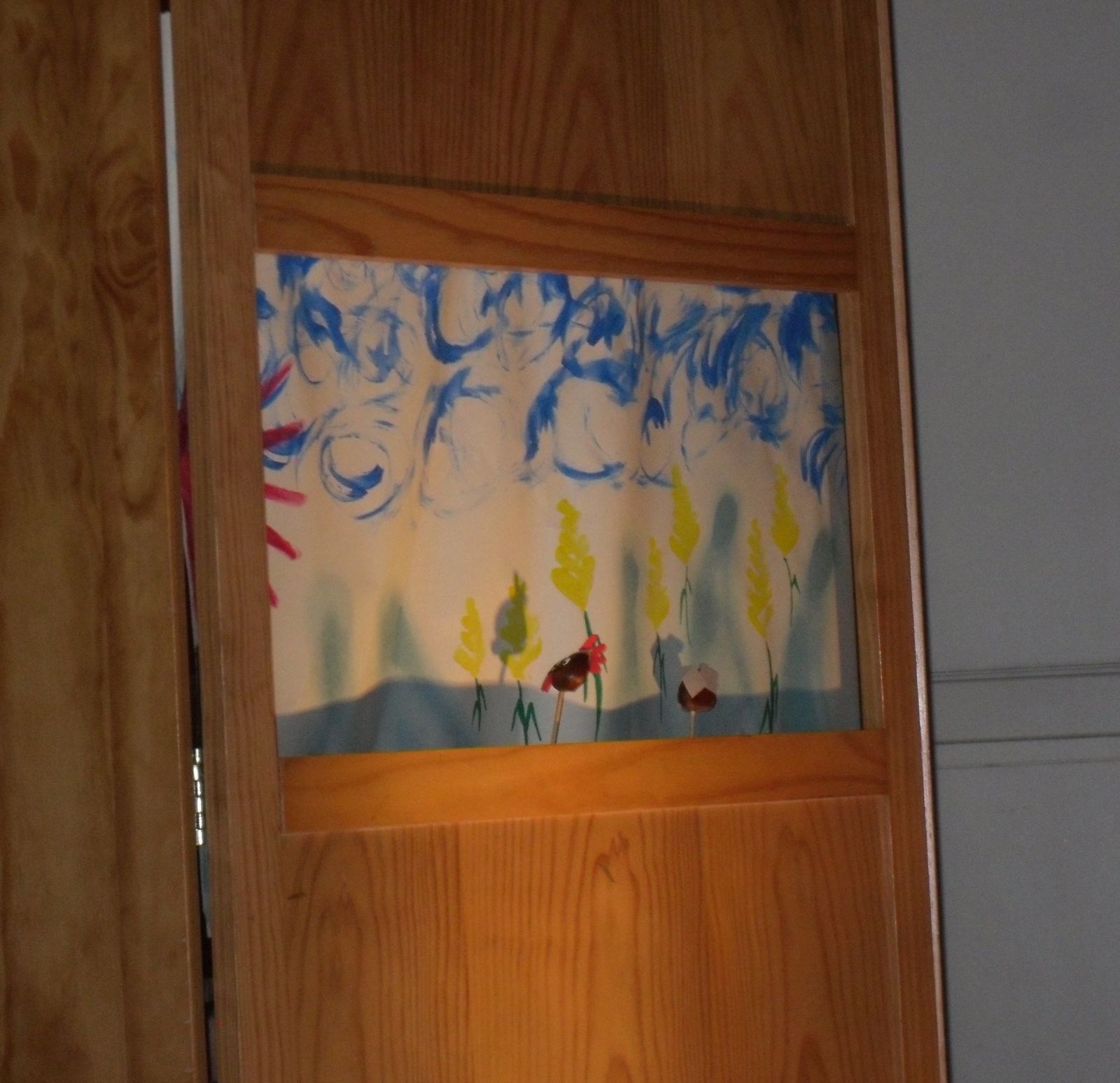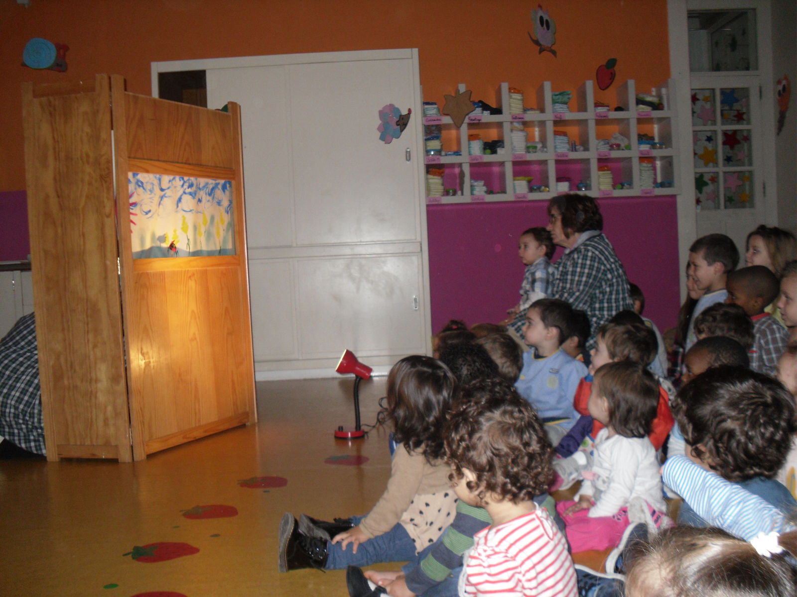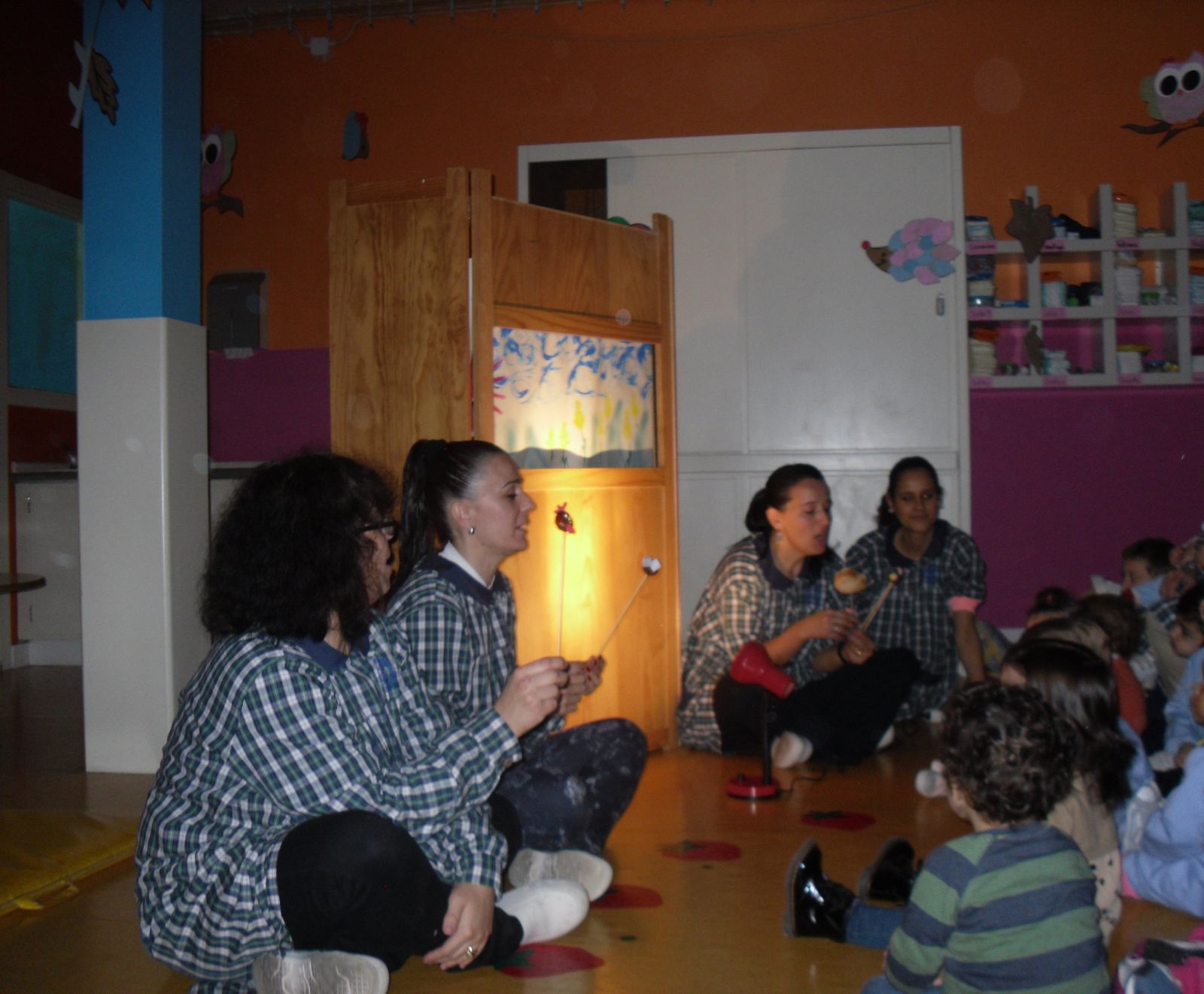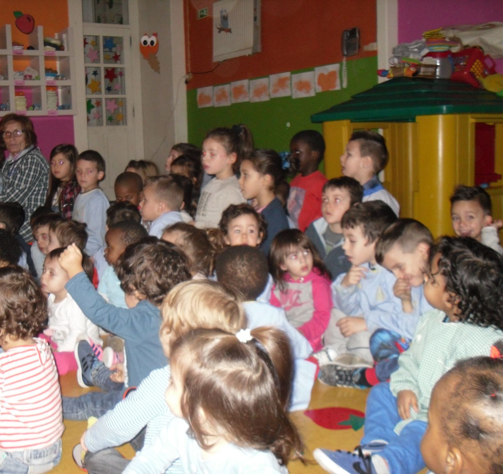As salas da creche e do jardim de infância juntaram-se para ver um teatro de fantoches em que as personagens eram feitas de castanhas. A história era a “Galinha Ruiva”, que contava a aventura de uma galinha para semear, plantar, colher e moer a farinha para fazer um belo pão e em que a moral da história é que quem quer coisas boas tem de trabalhar para as ter!