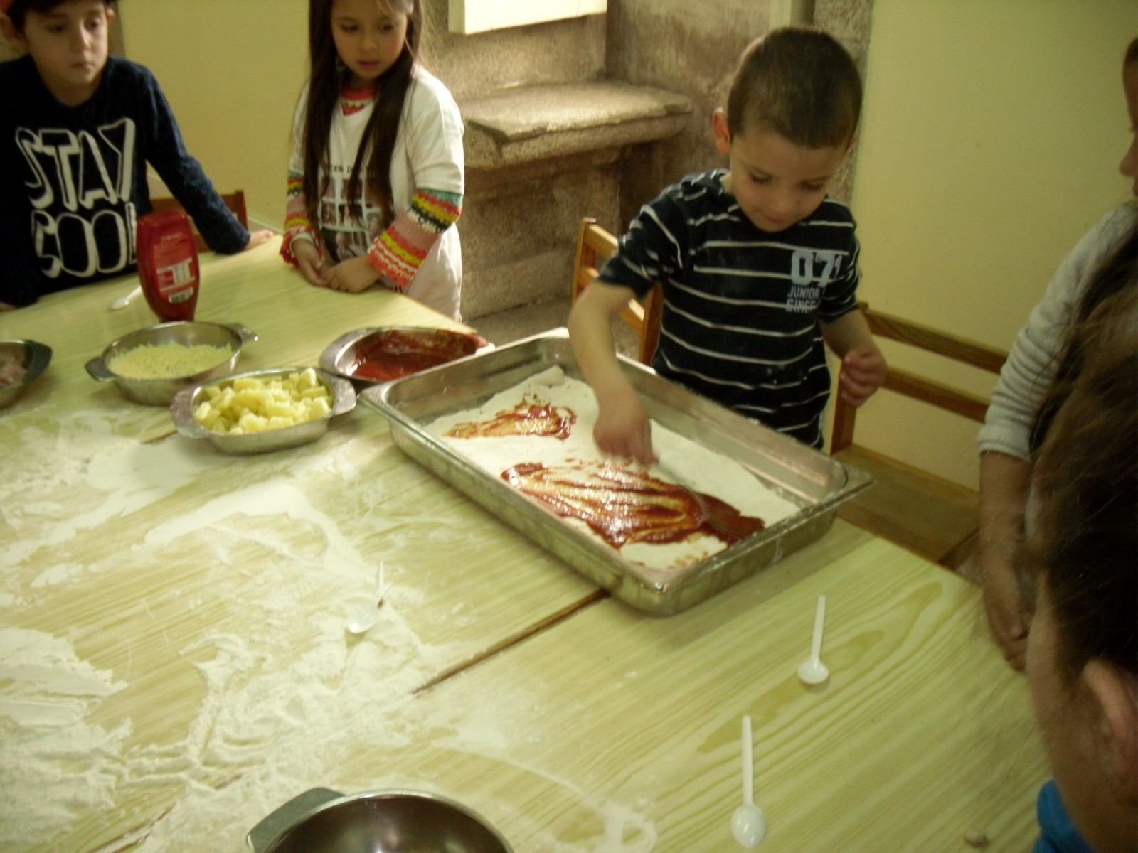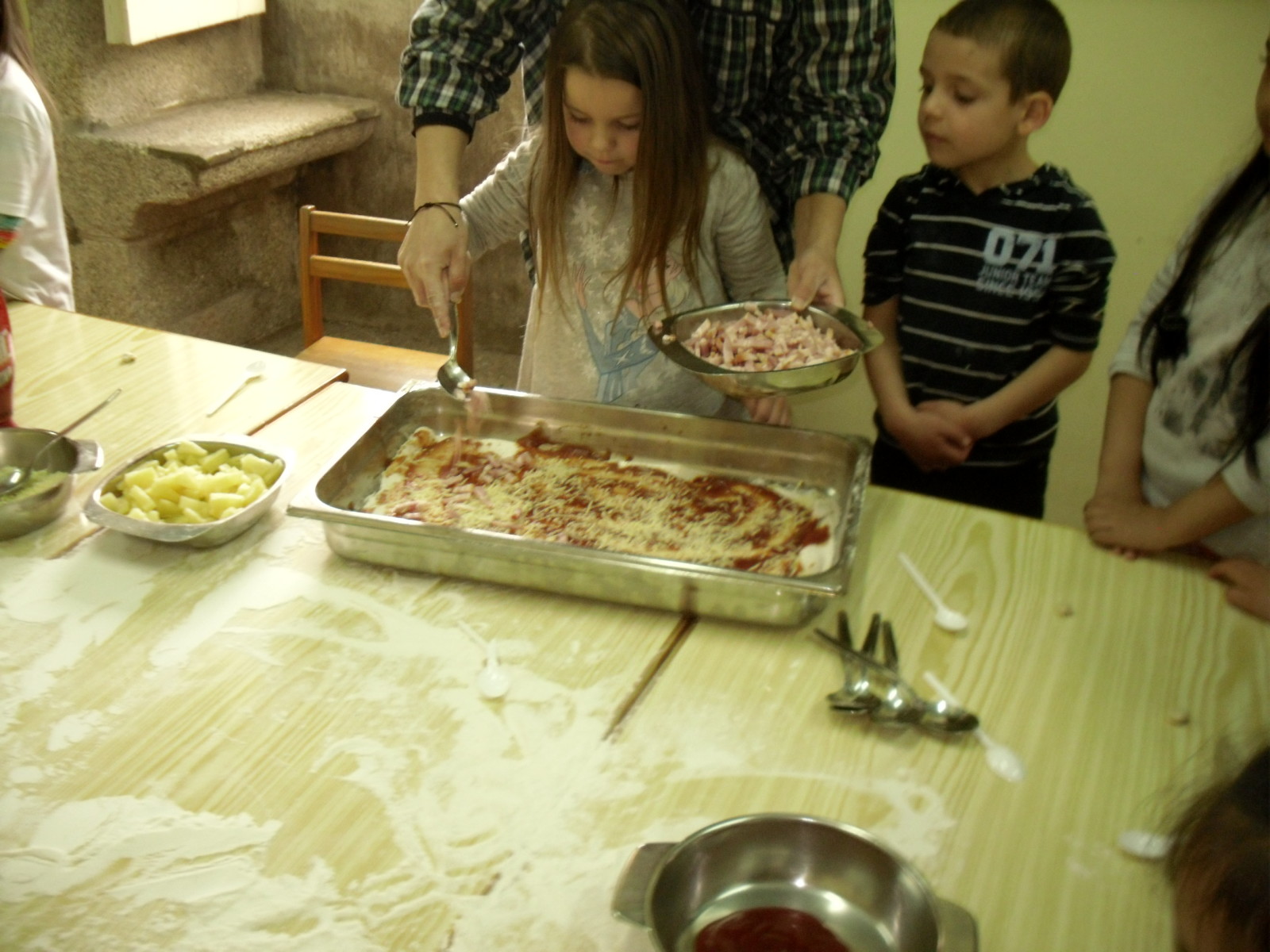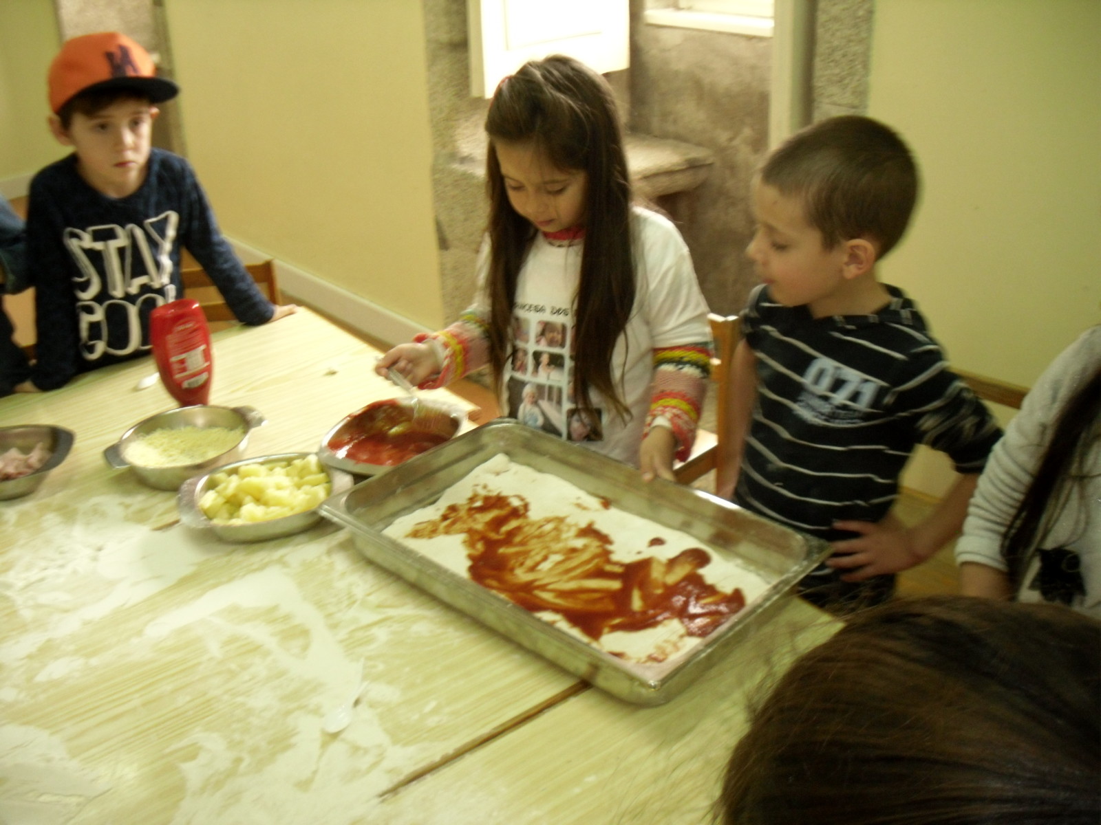 Para esta atividade os meninos contaram com a colaboração preciosa dos pais. Cada menino ficou com a responsabilidade de trazer um ingrediente de casa. Para além da massa, tivemos bacon, fiambre, salsichas, milho, cogumelos, azeitonas. queijo, molho de tomate, atum e ananás.