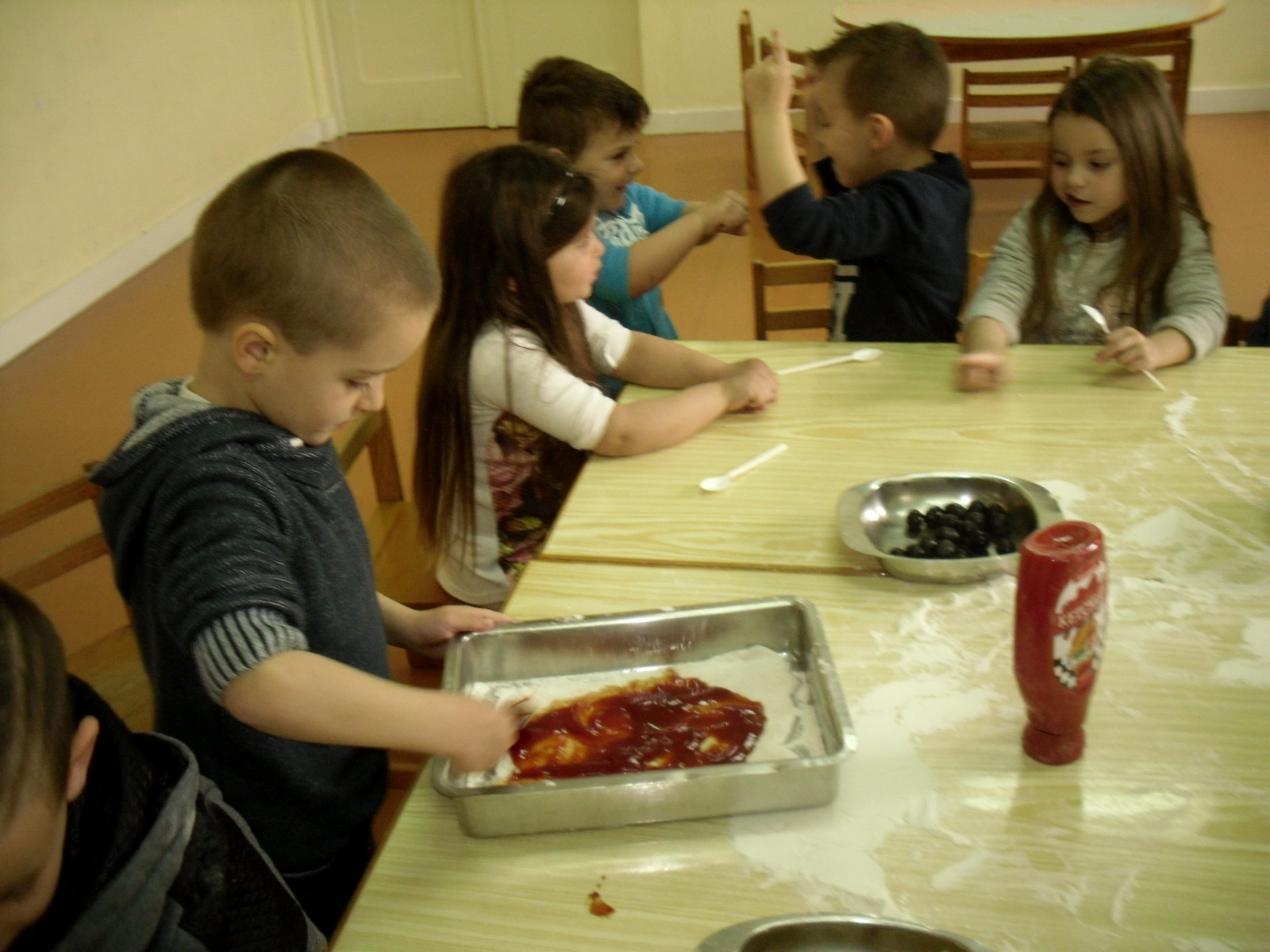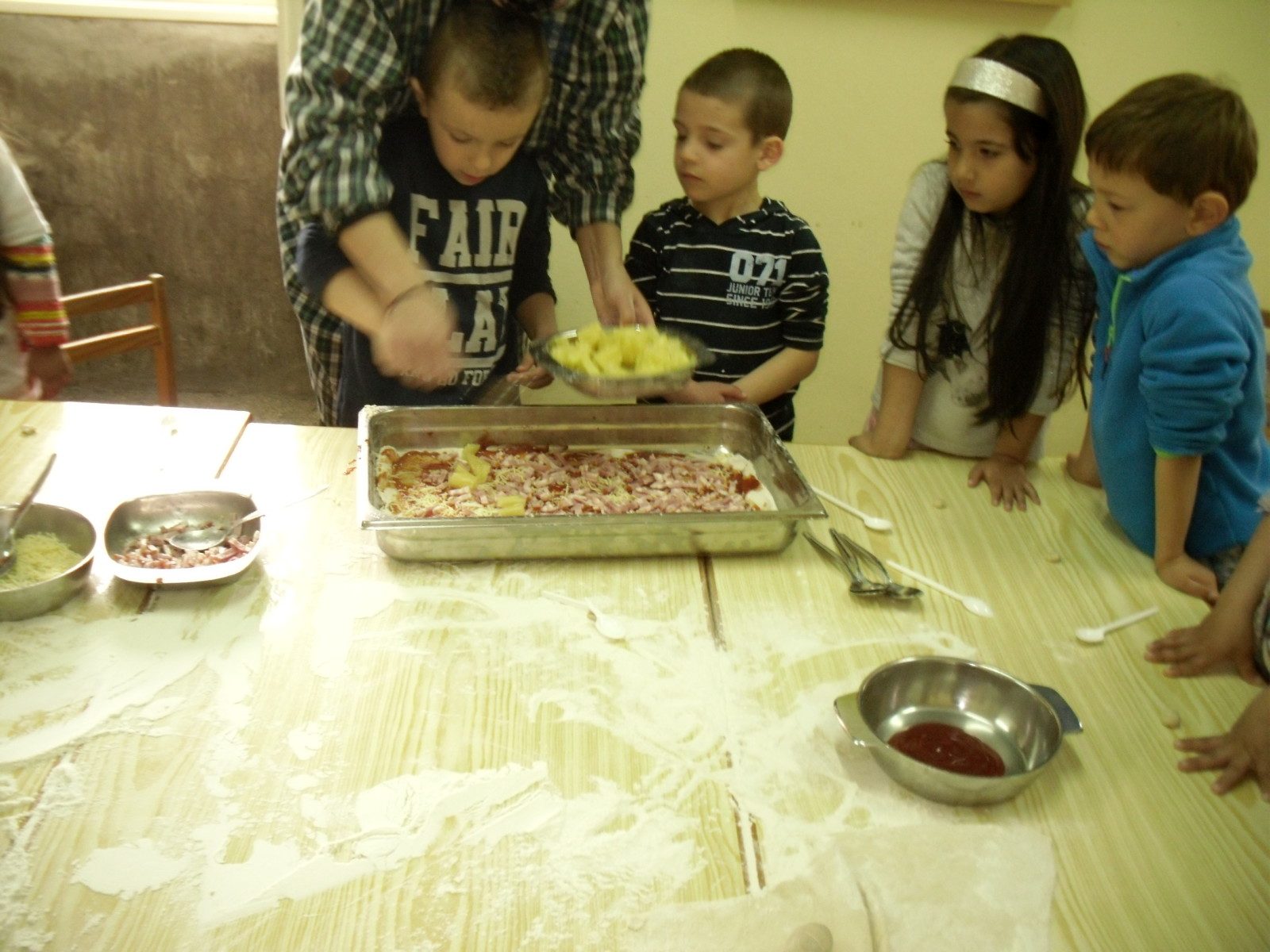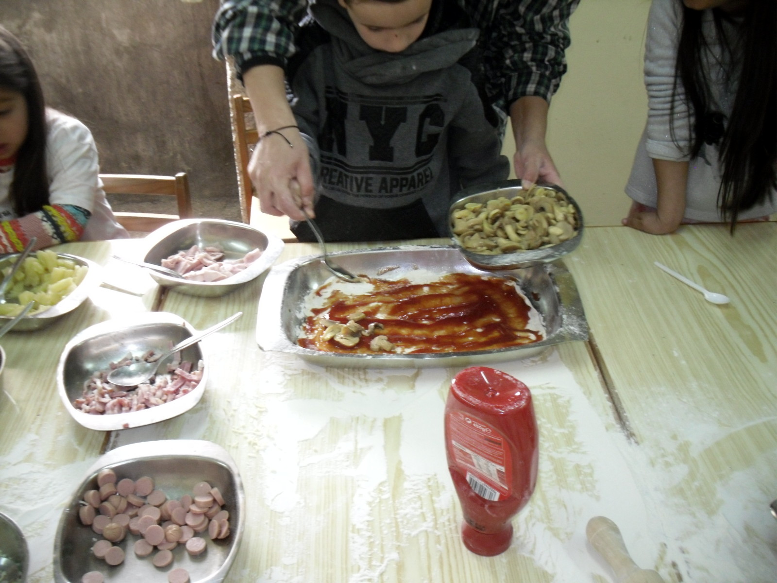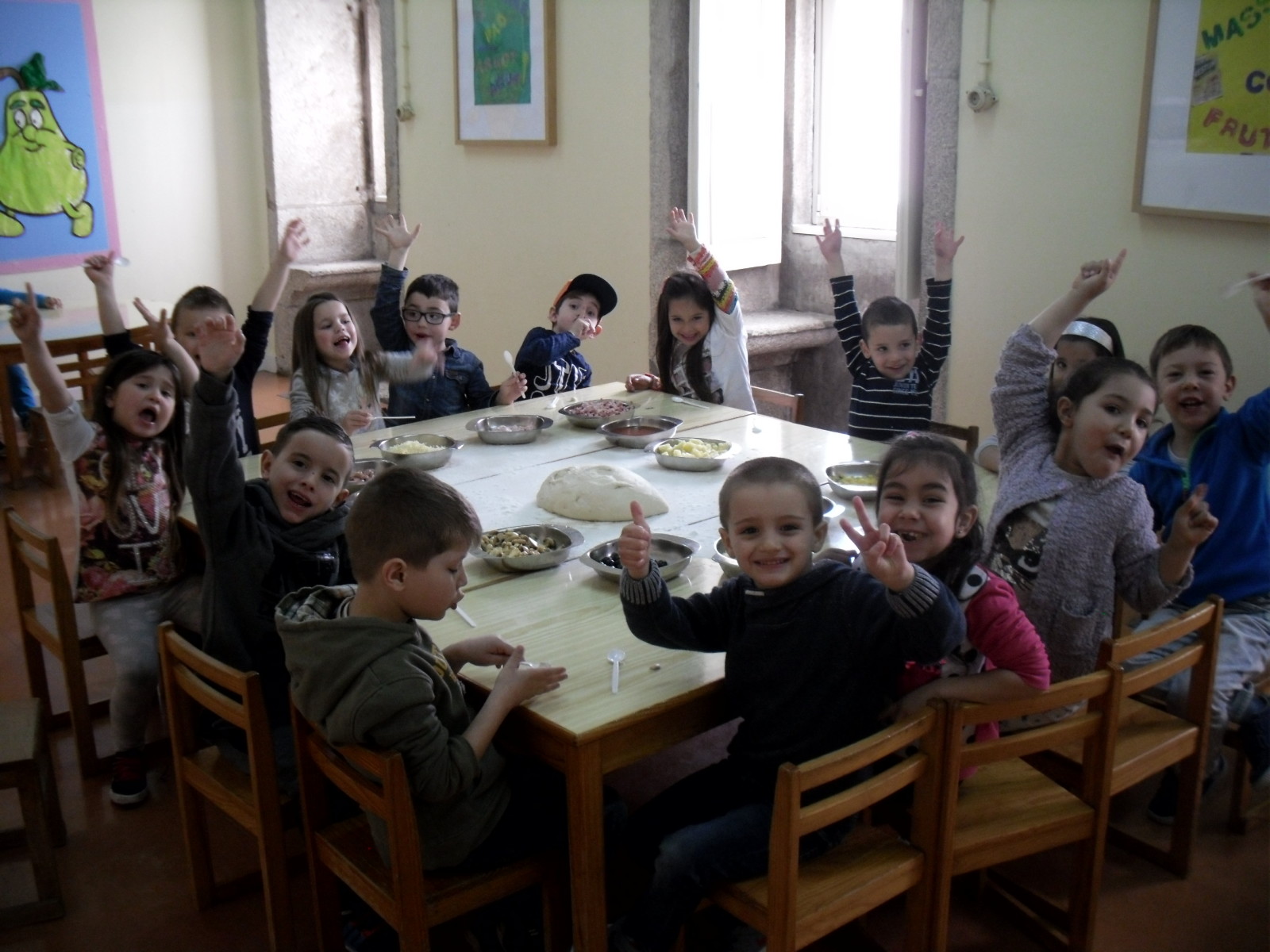 Para esta atividade os meninos contaram com a colaboração preciosa dos pais. Cada menino ficou com a responsabilidade de trazer um ingrediente de casa. Para além da massa, tivemos bacon, fiambre, salsichas, milho, cogumelos, azeitonas. queijo, molho de tomate, atum e ananás.