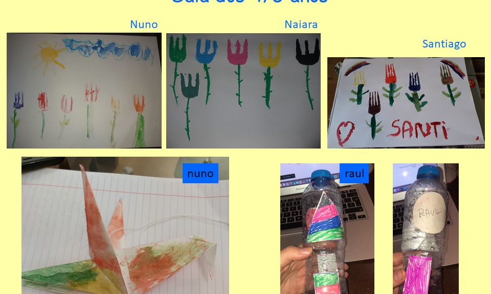 A Matilde, a Naiara, o Raul, o Nuno e o Santiago enviaram fotos dos seus trabalhos, e ainda vídeos dos seus momentos de ginástica e de inglês.