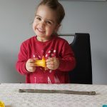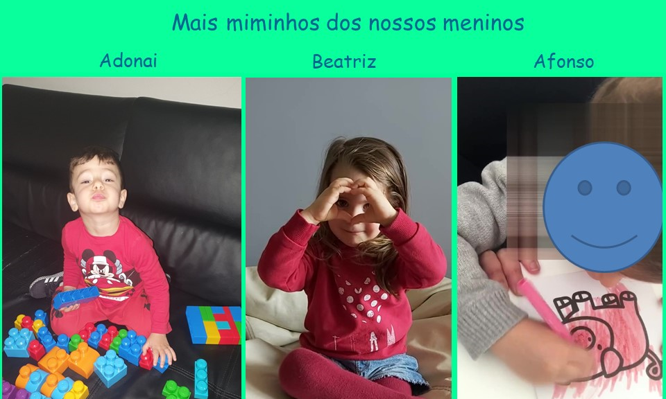 Mostramos fotos e vídeos do Adonai, num jogo de coordenação, da Beatriz a dizer as cores em inglês e do Afonso a colorir um porquinho bem cor de rosa.