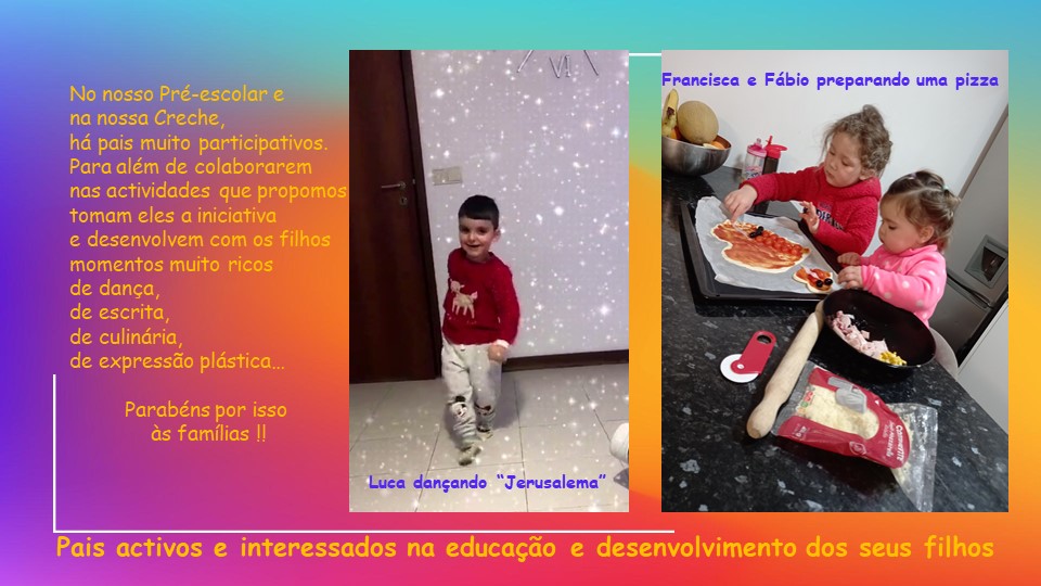 Para além de colaborarem nas actividades que propomos tomam eles a iniciativa e desenvolvem com os filhos momentos muito ricos de dança, de escrita, de culinária, de expressão plástica…