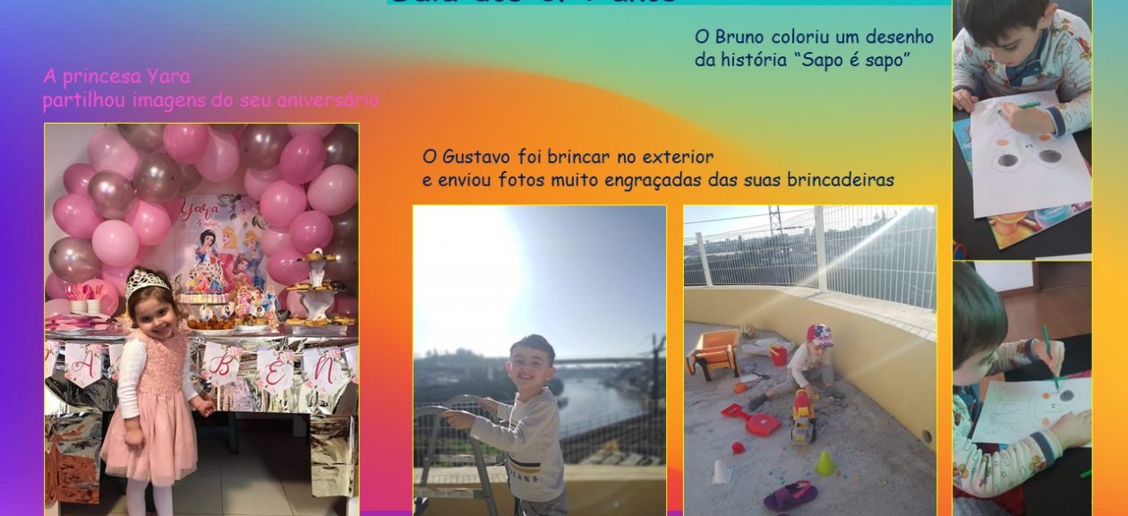 A Yara fez 4 anos e quis enviar imagens e uma mensagem da princesa que foi nesse dia especial, o Gustavo foi brincar um pouquinho para o ar livre e enviou imagens dos trabalhos com a sua betoneira e do seu sorriso bem disposto e o Bruno mostra como está tão concentrado a pintar o sapo da história que a sua educadora enviou,