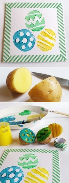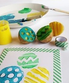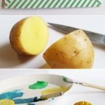 E agora vamos fazer carimbagem com a ajuda de batatas partidas ao meio, uma folha de papel e tintas bem coloridas.